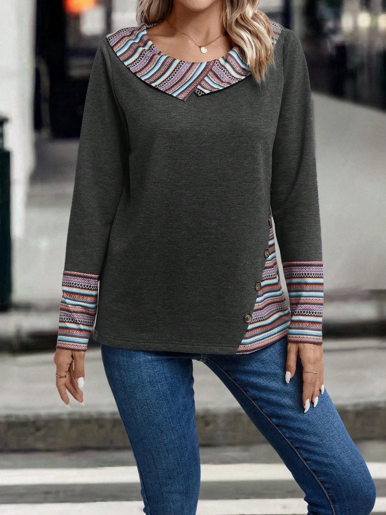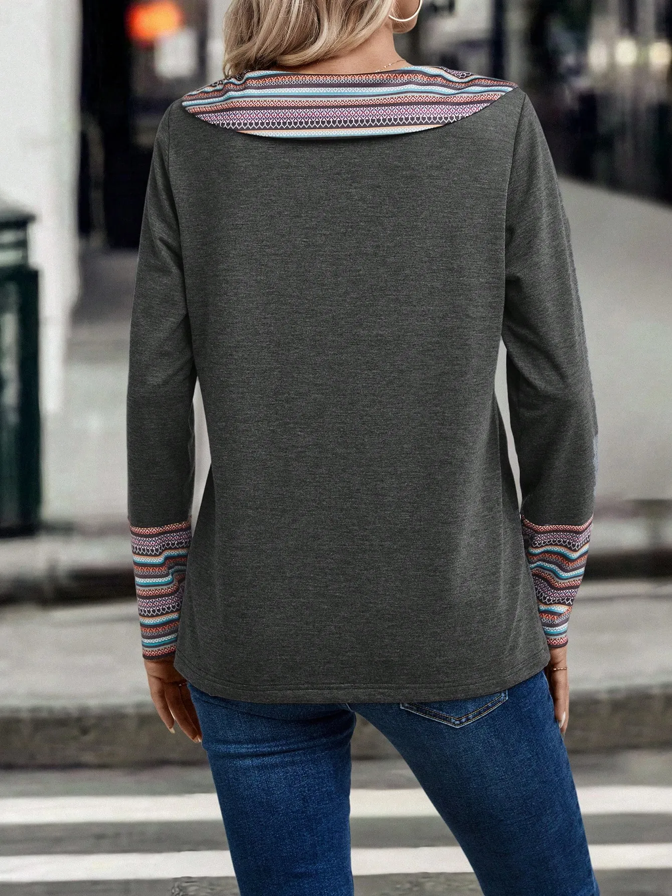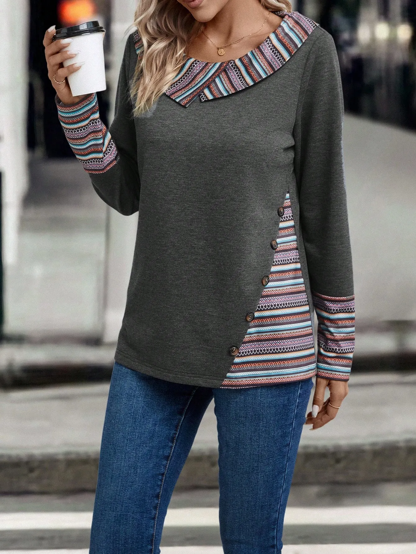 SMY Women’s V-neck Button Decoration Patchwork Long Sleeve Casual T-shirt
