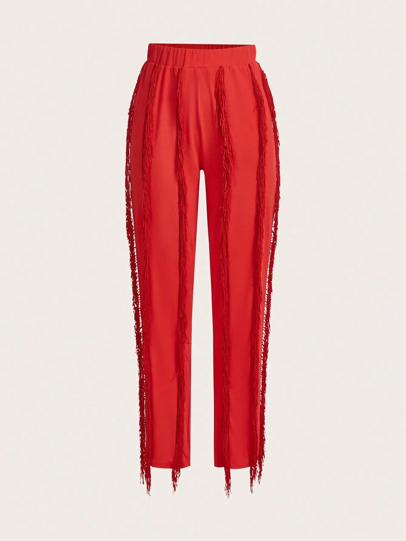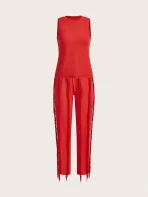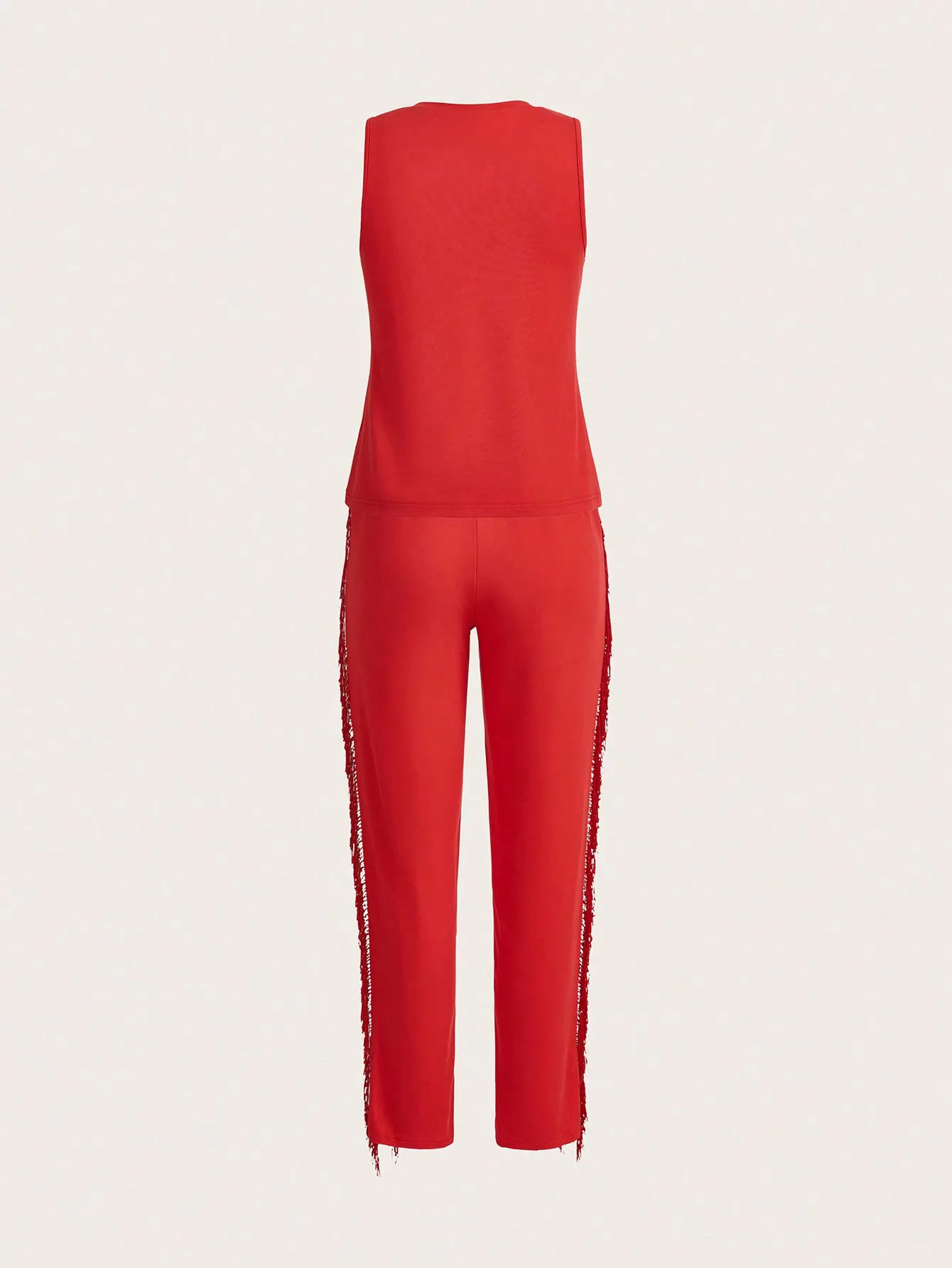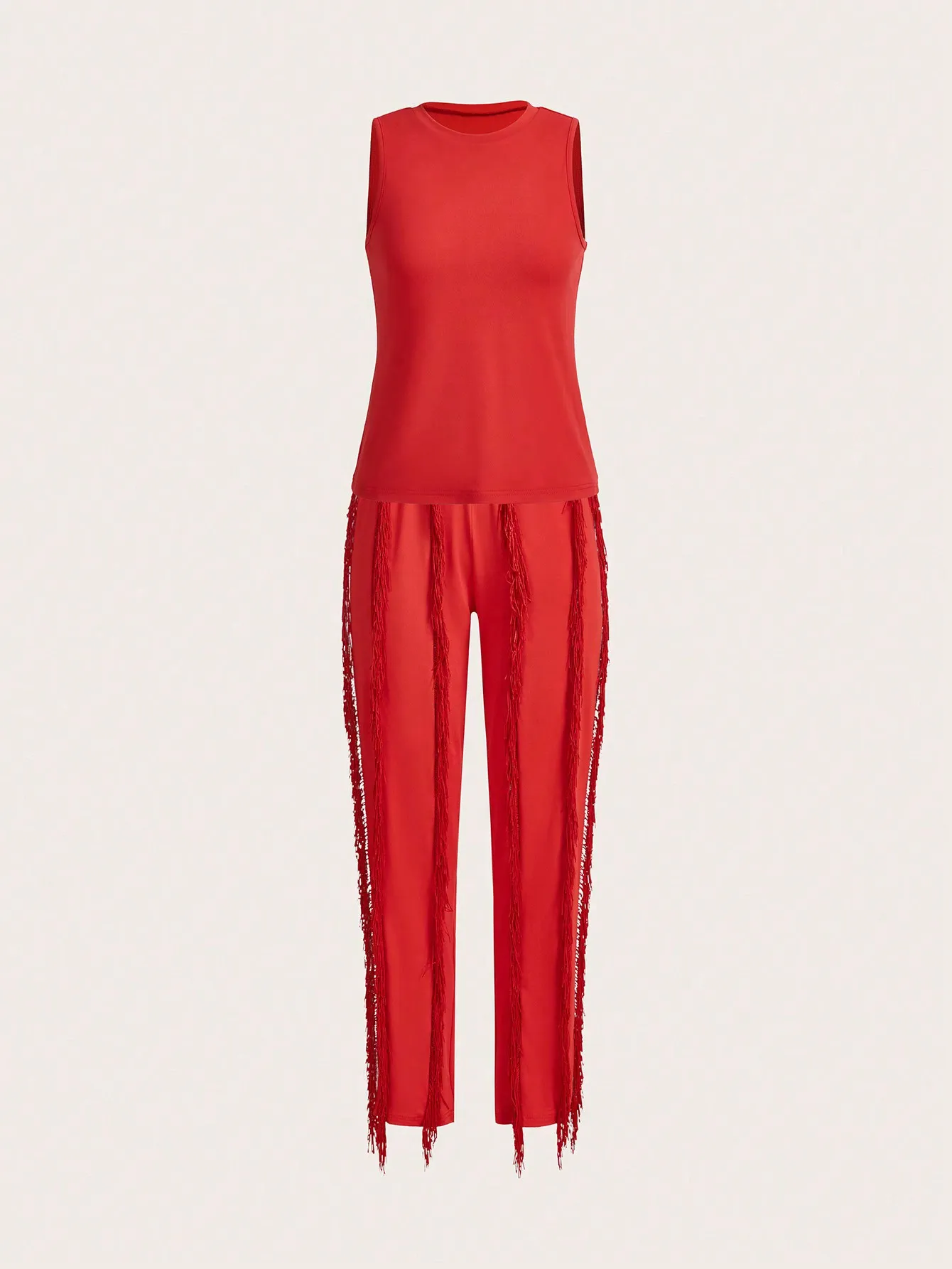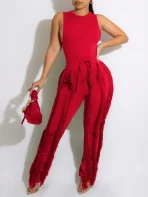SMY Unity Women’s Casual Solid Color Sleeveless Jumpsuit With Tassel Detail, 2pcs/Set