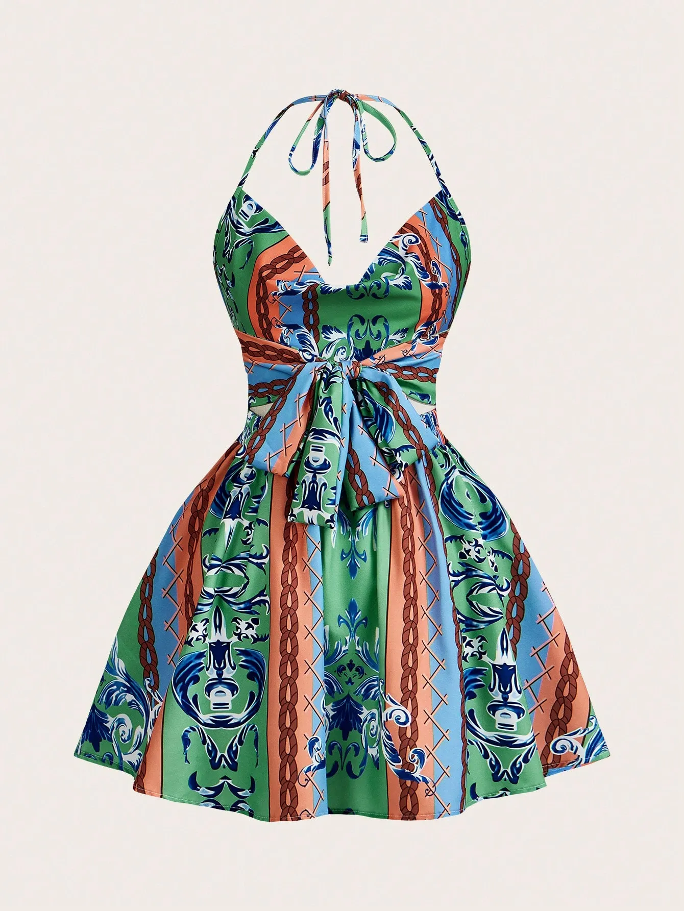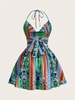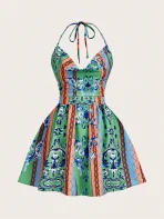 SMY Unity Women’s Fashion Digital Print Halter Backless Sleeveless Dress