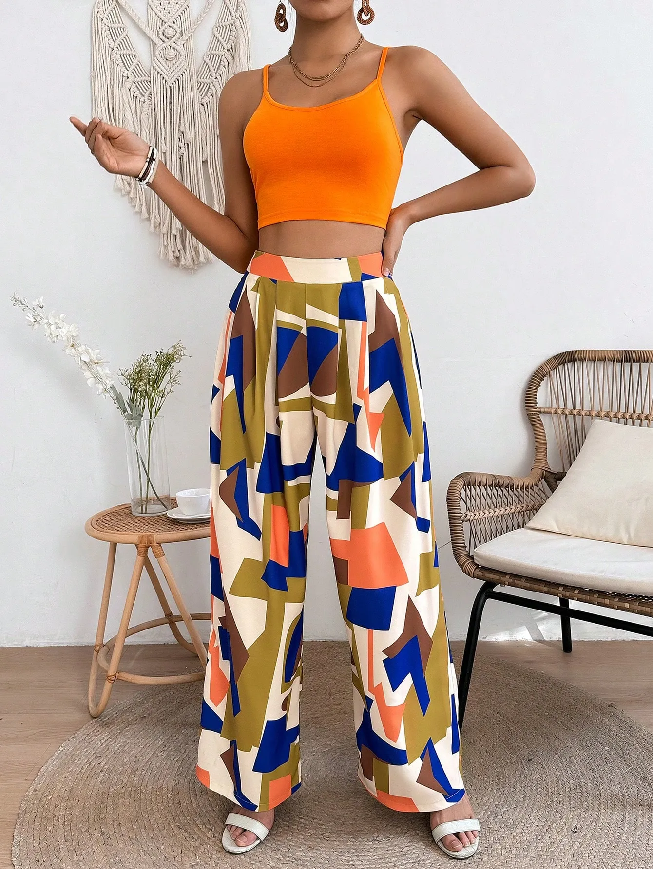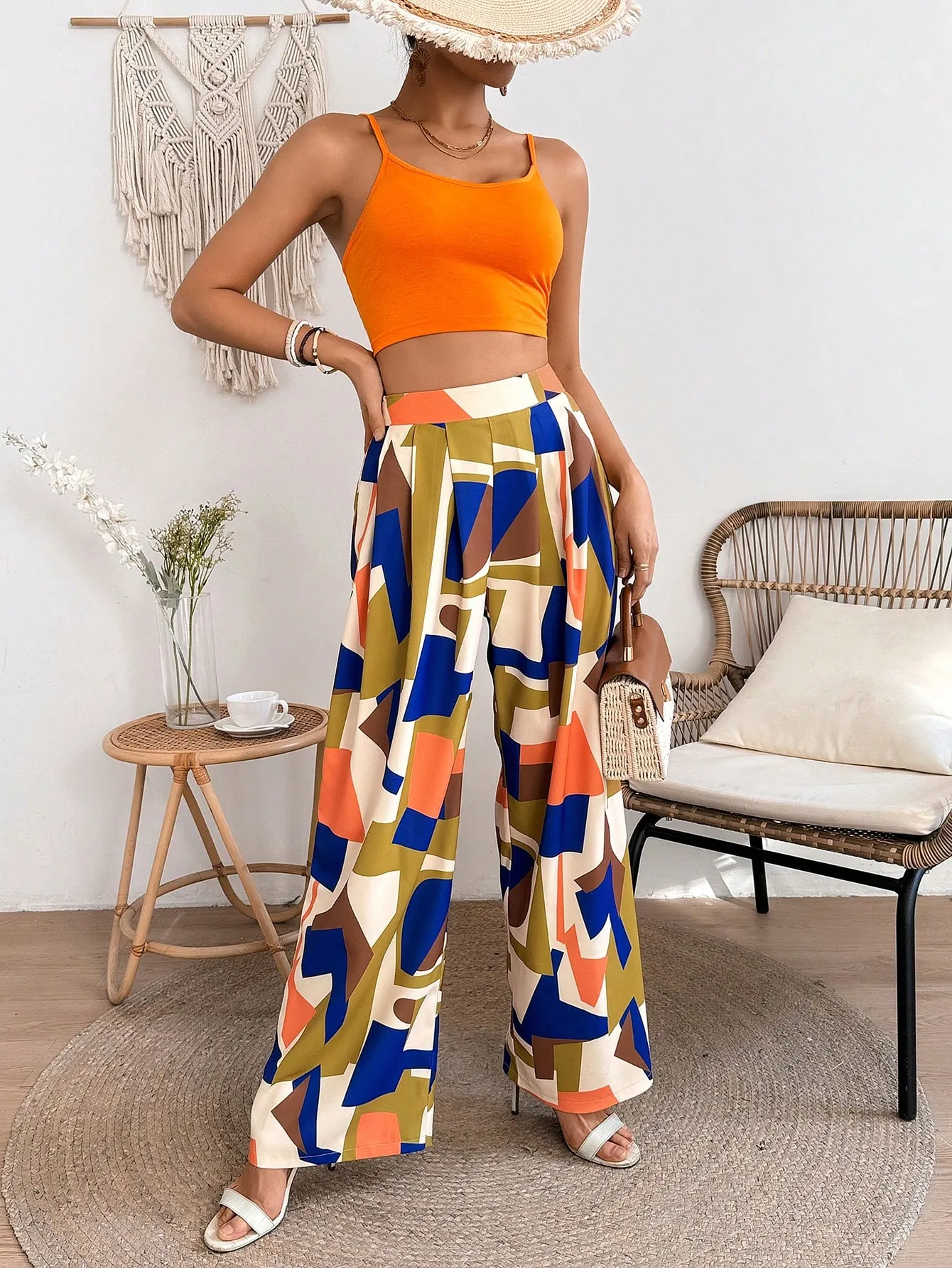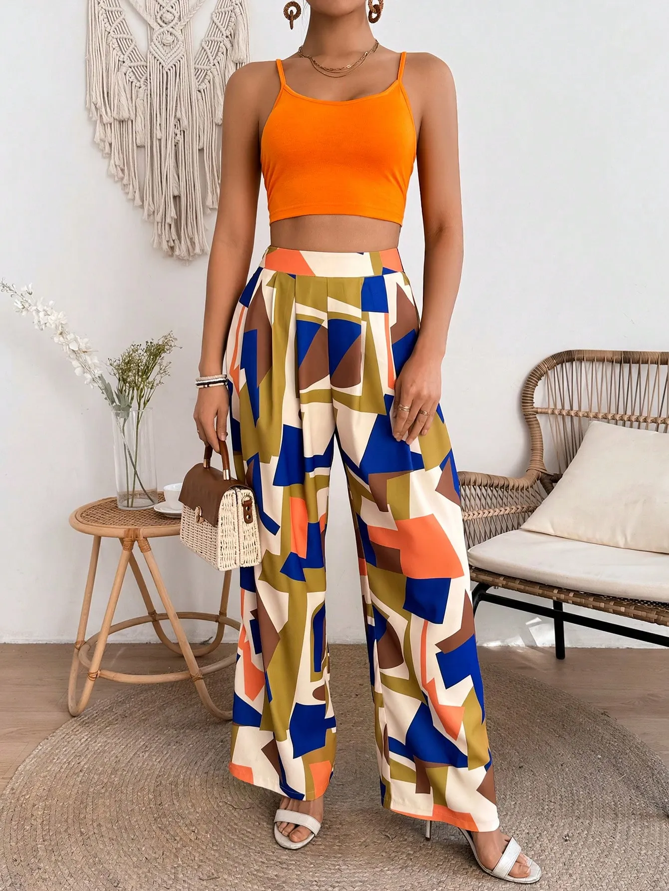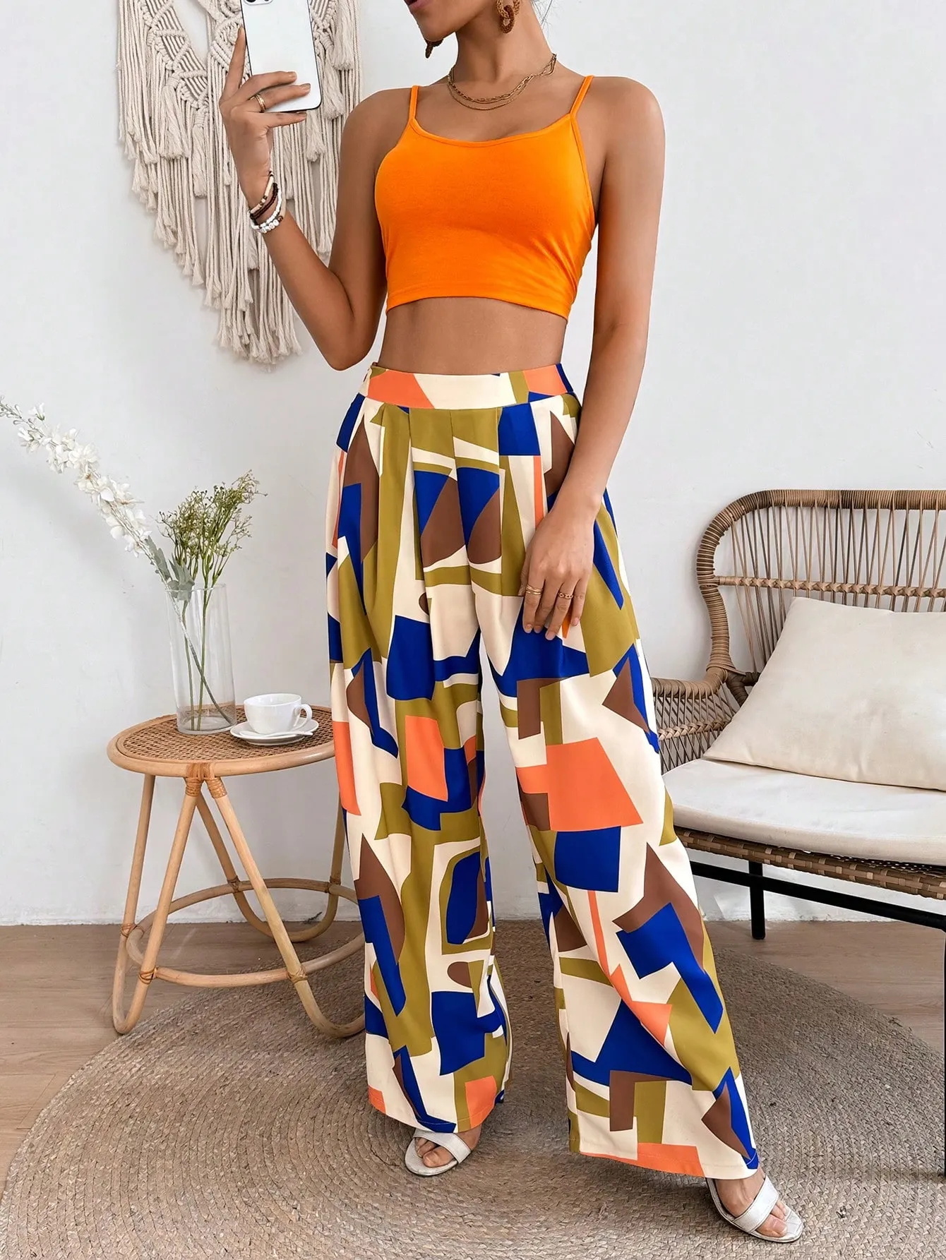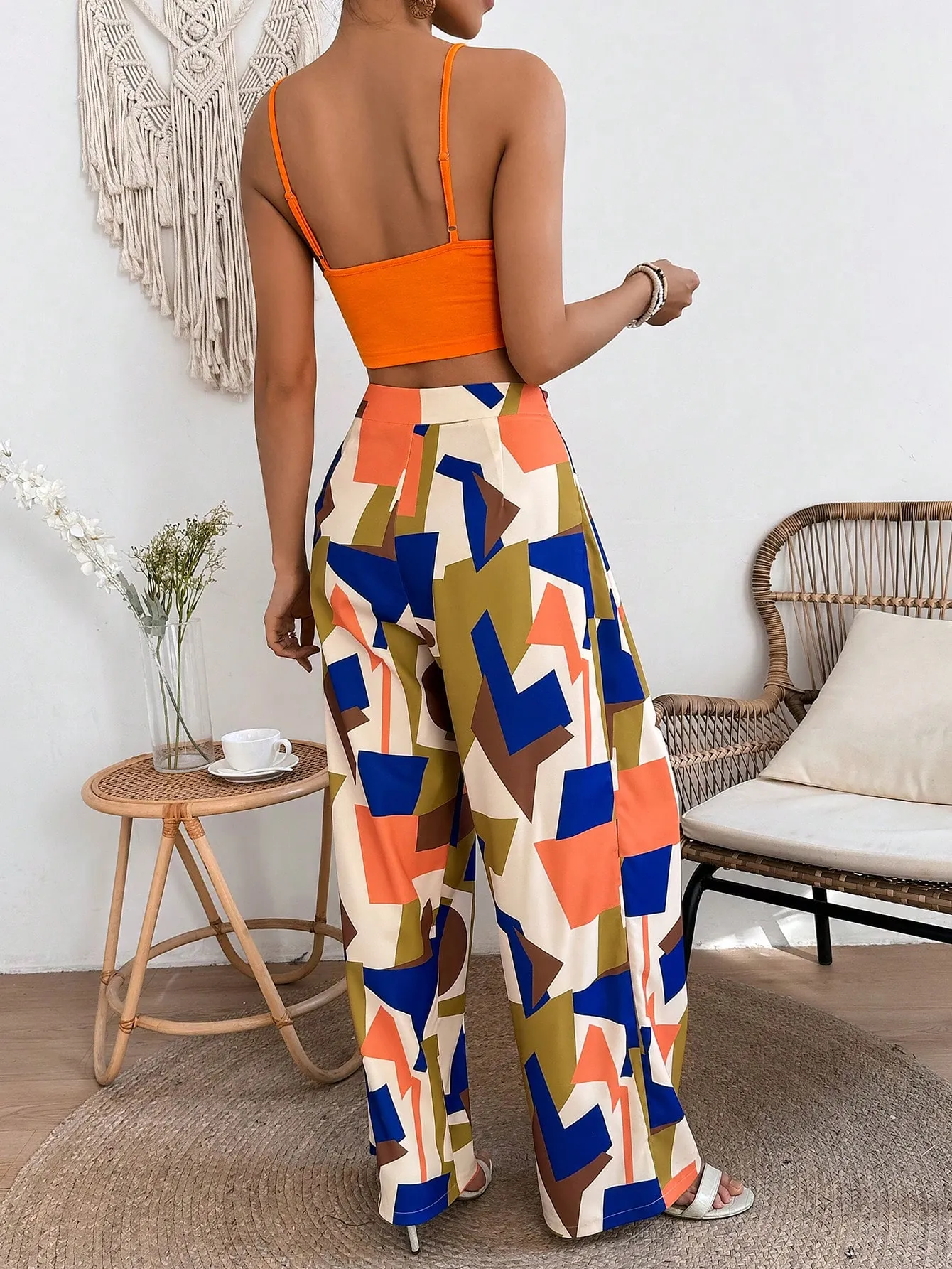 Be the first to review “SMY VCAY Women’s Solid Color Cropped Strappy Camisole Top And Geometric Pattern Pants Two Piece Set” Cancel reply