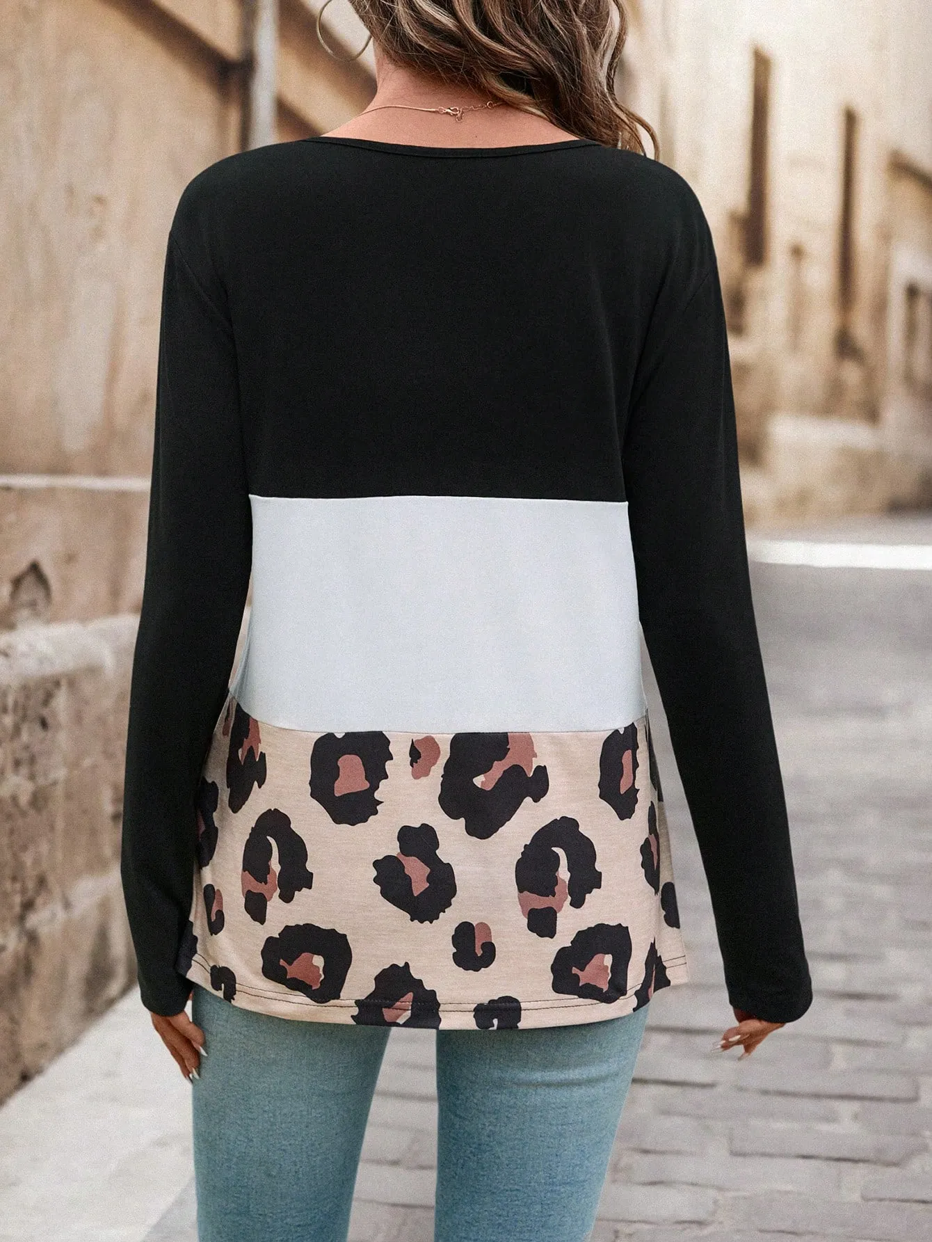 SMY Women Casual V-Neck Colorblock Leopard Print Long Sleeve Top