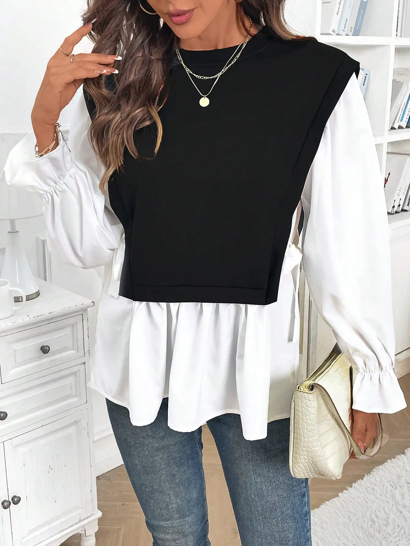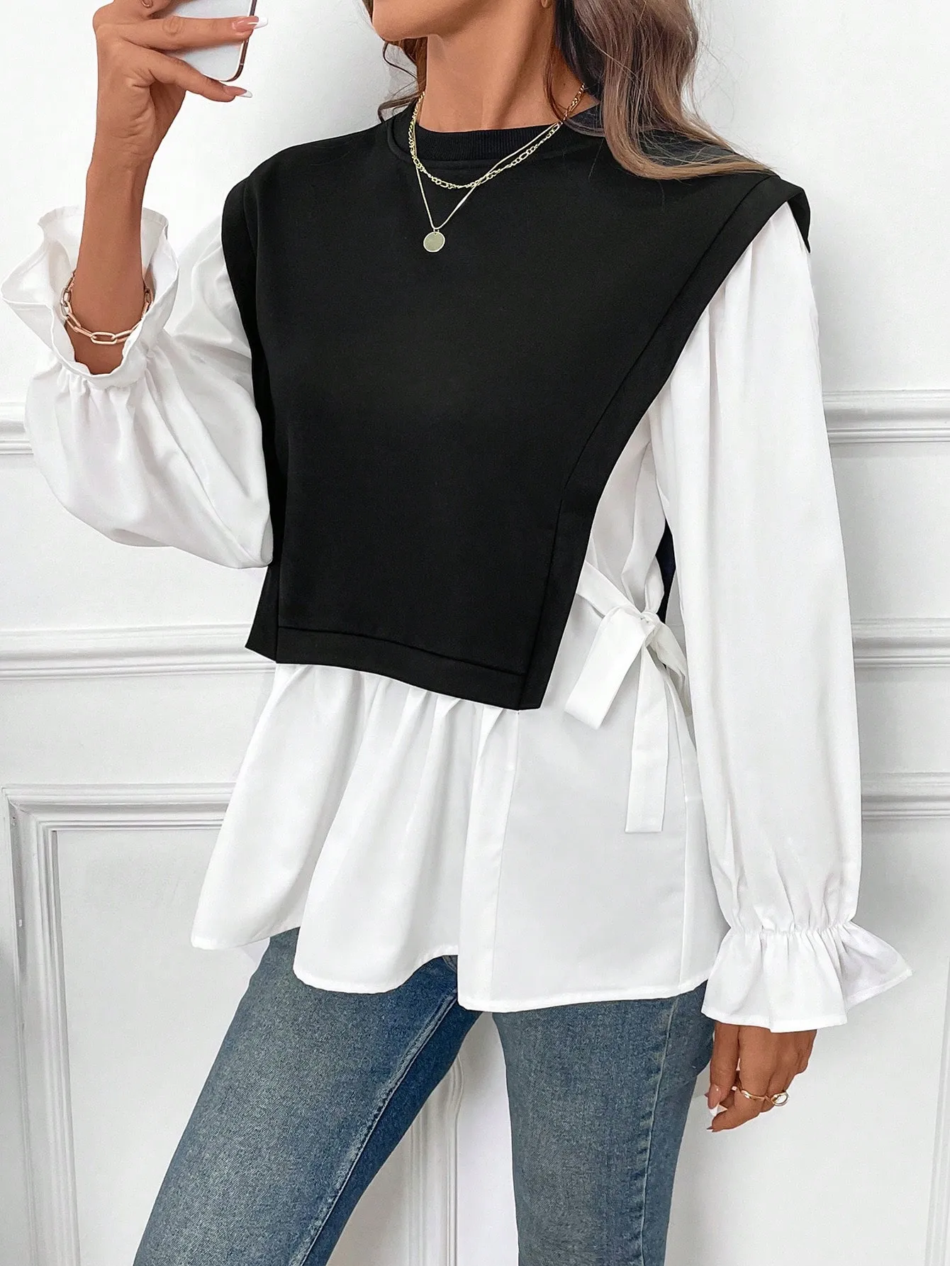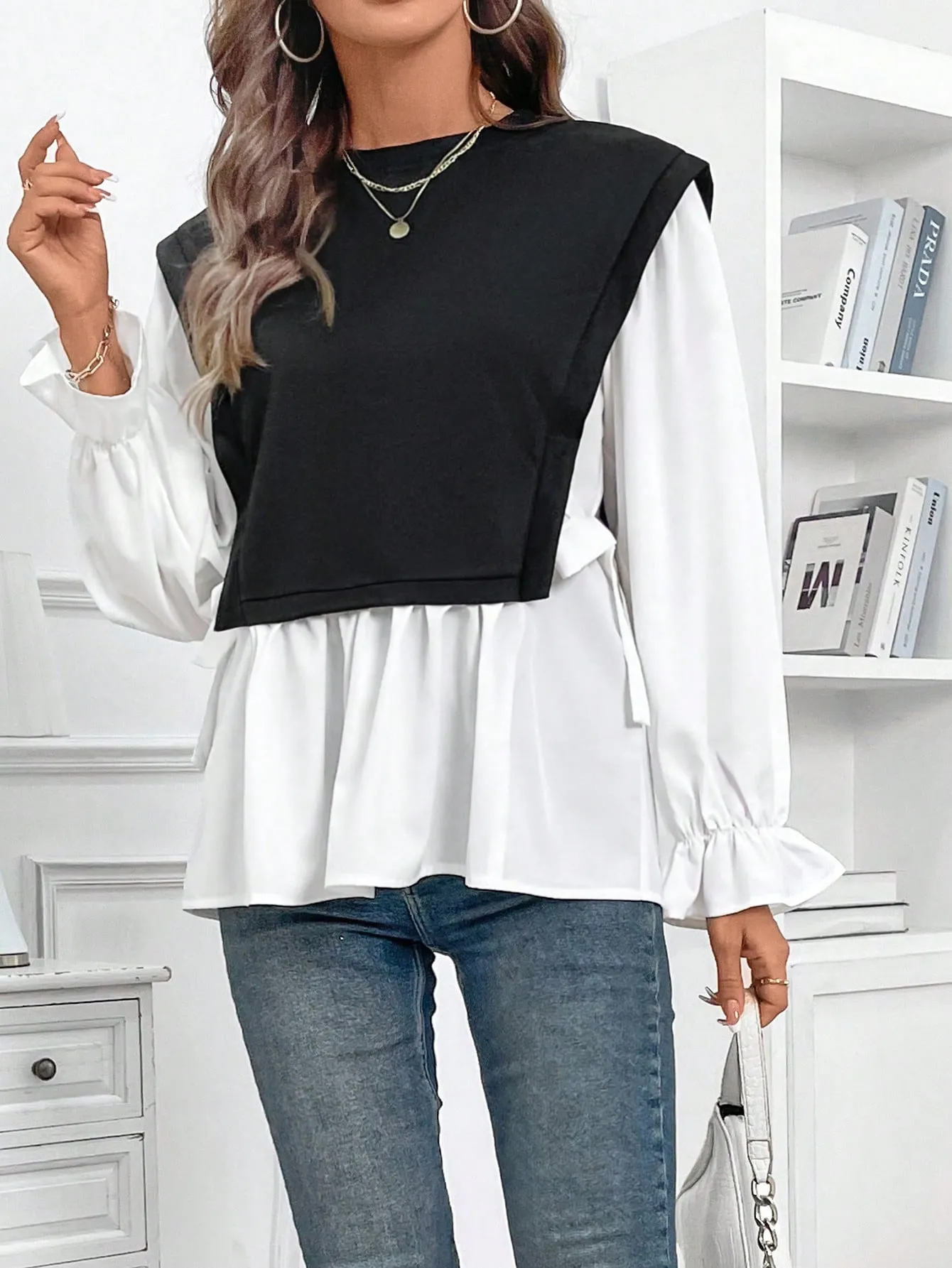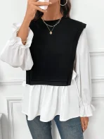 SMY Women’s Casual Color Block Splice 2 In 1 Long Sleeve Sweatshirt