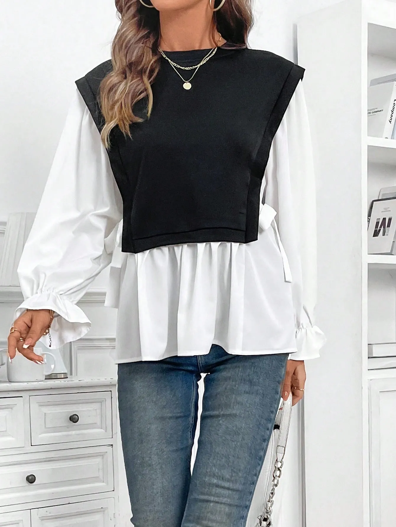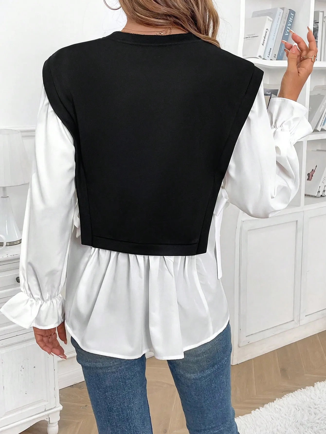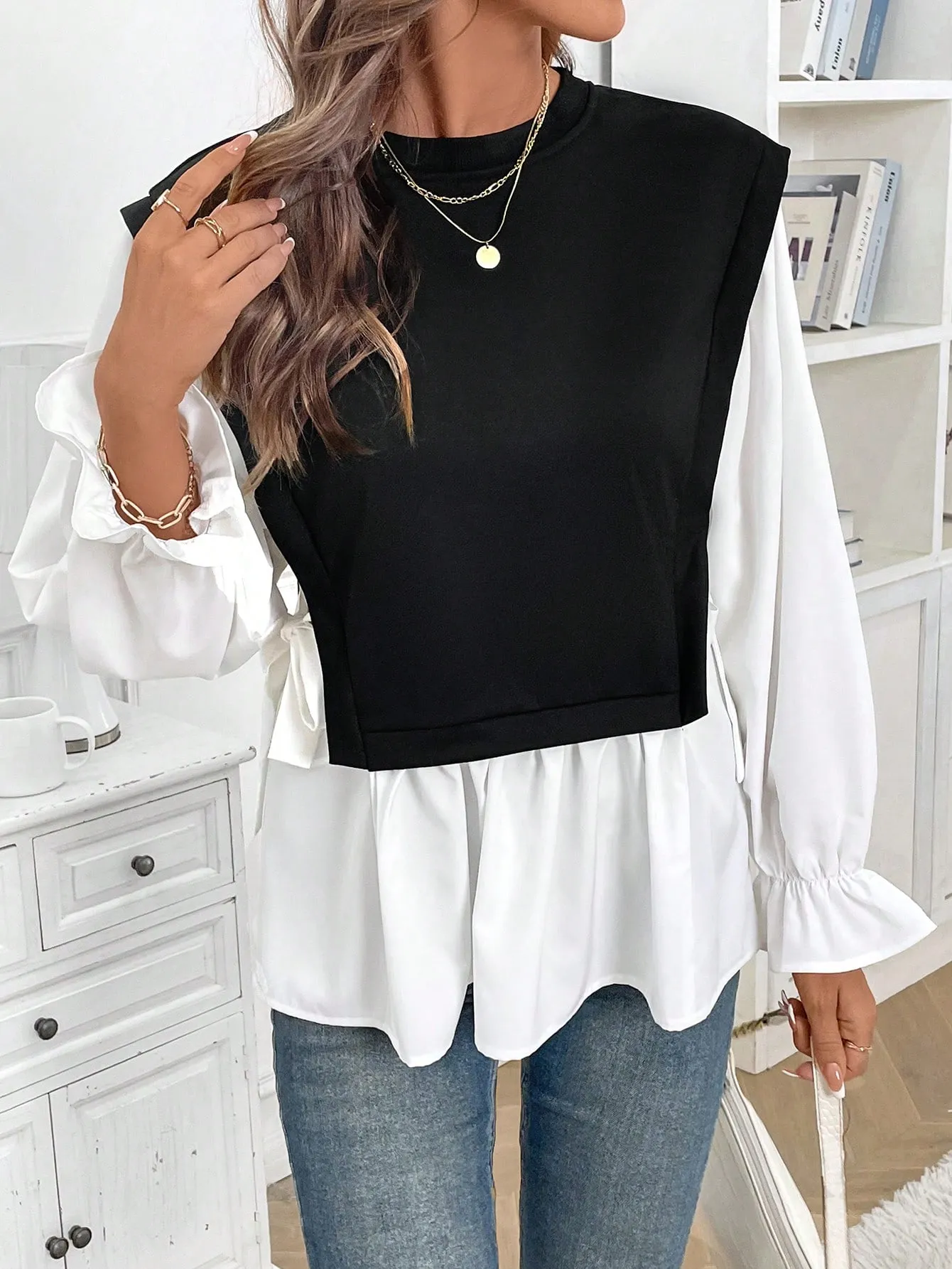 SMY Women’s Casual Color Block Splice 2 In 1 Long Sleeve Sweatshirt