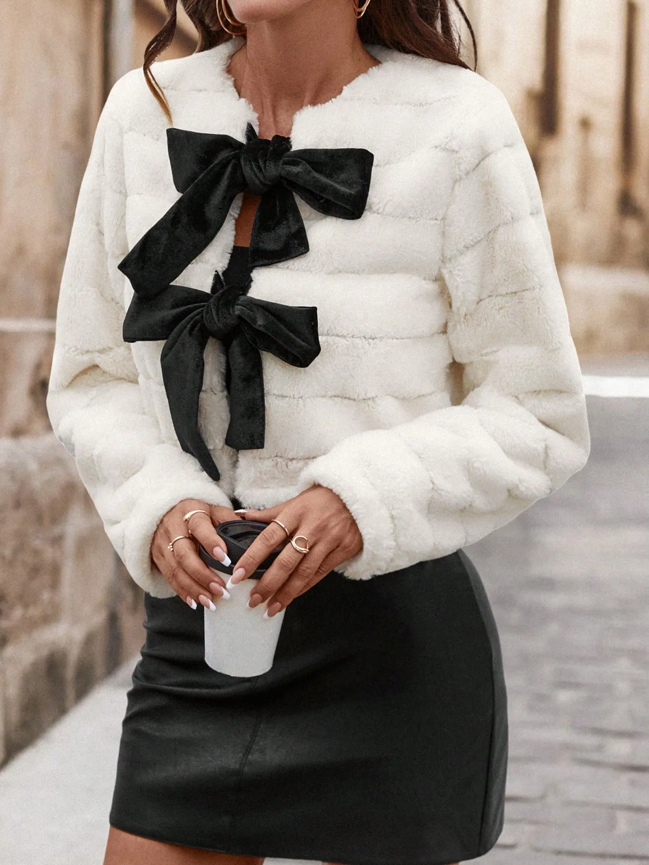 SMY Women’s Solid Color Contrast Fluffy Bow Jacket