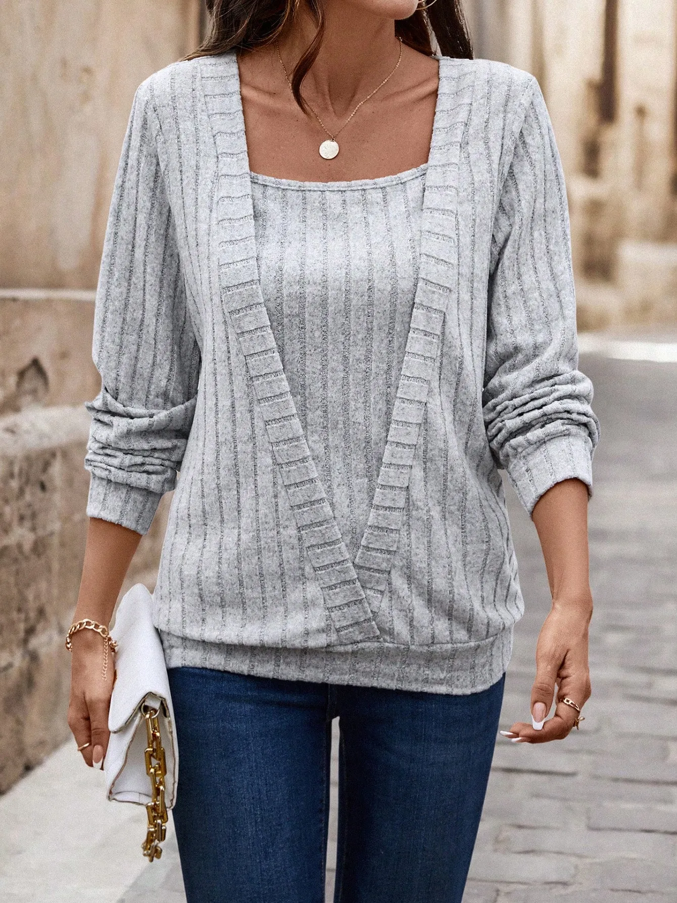 SMY Women’s Solid Color Rib Knit Embroidered 2-In-1 Casual Sweatshirt, Everyday Wear