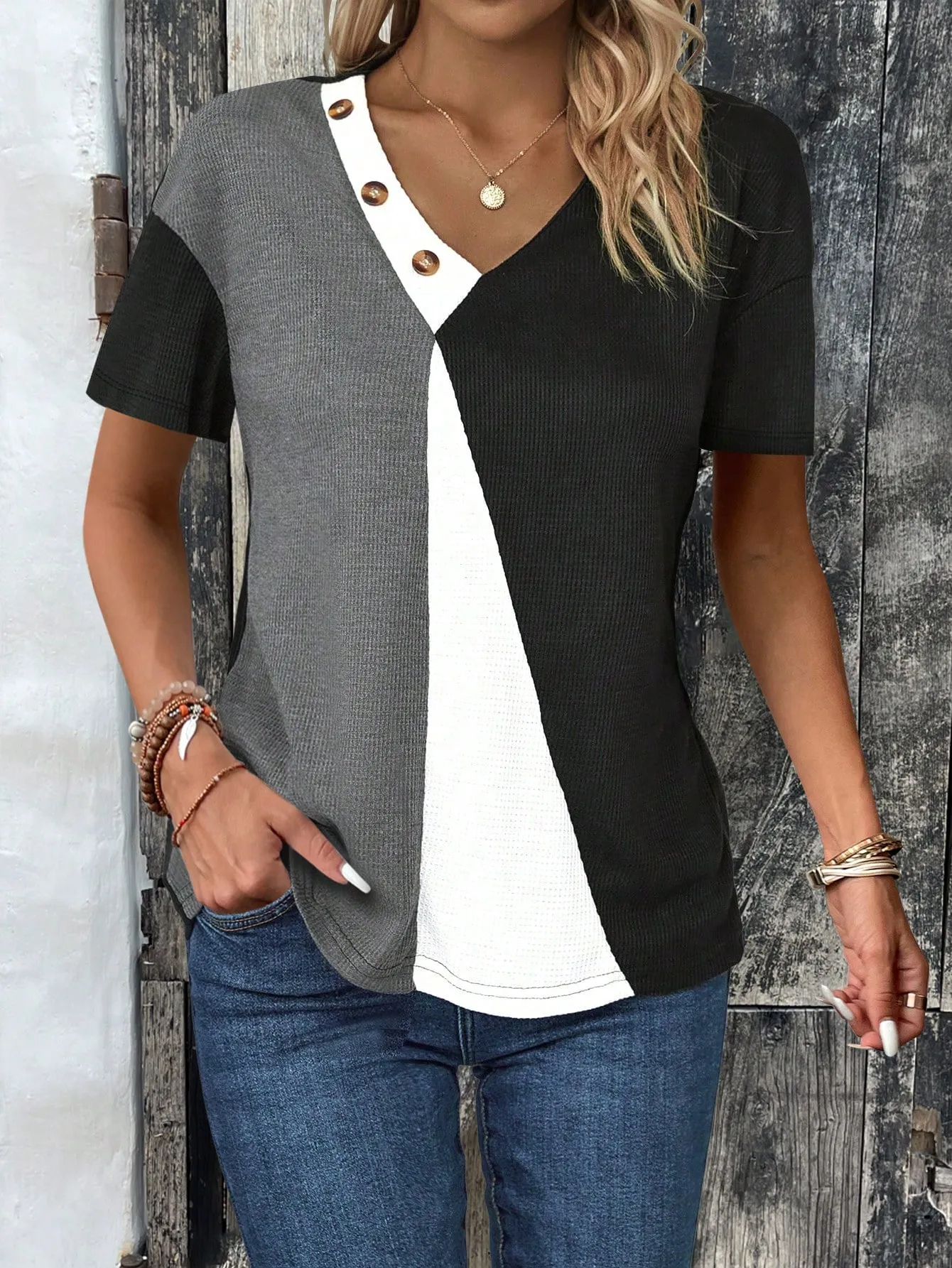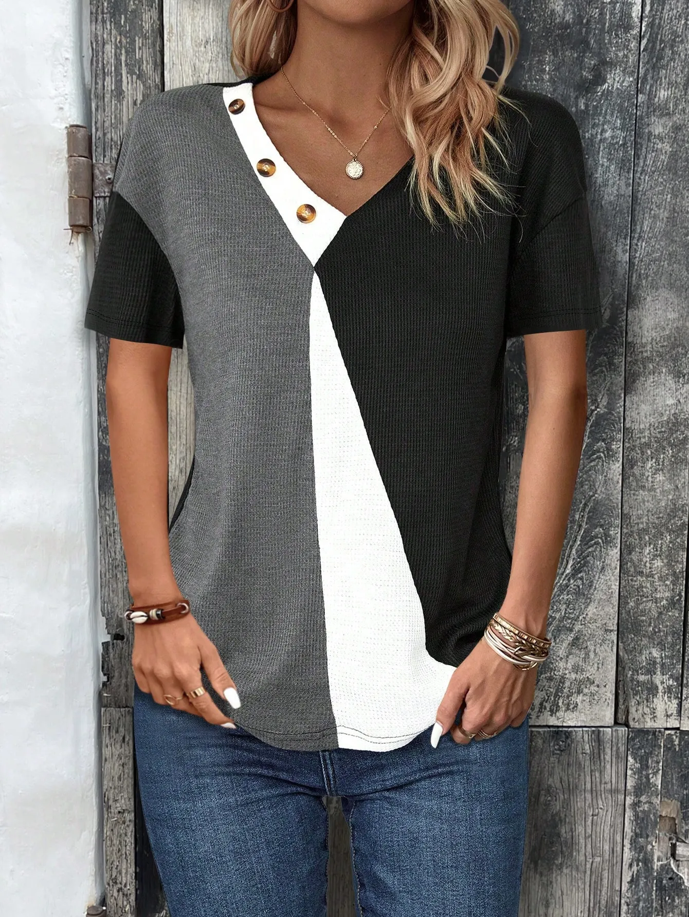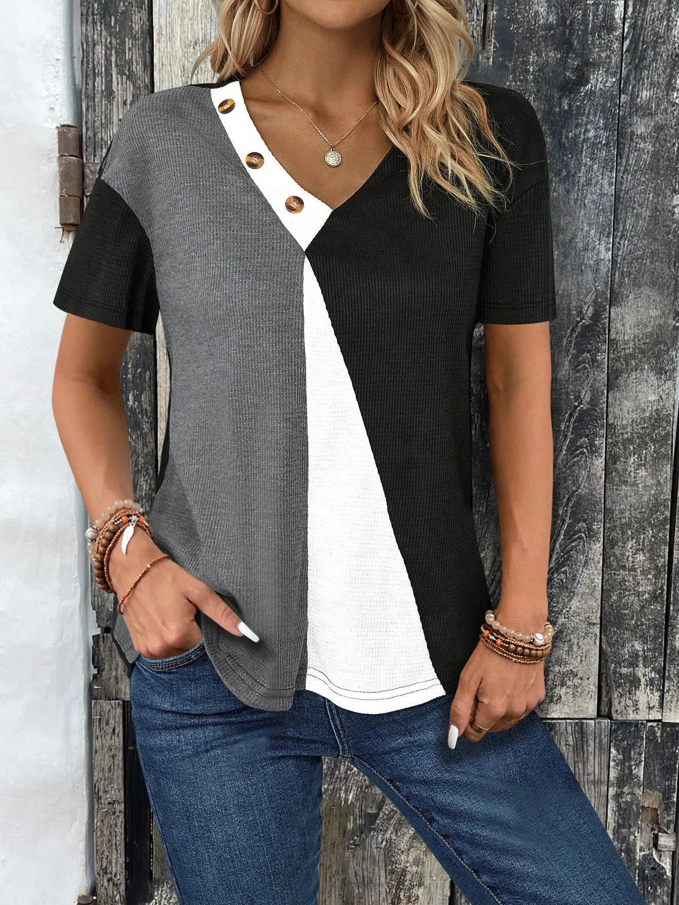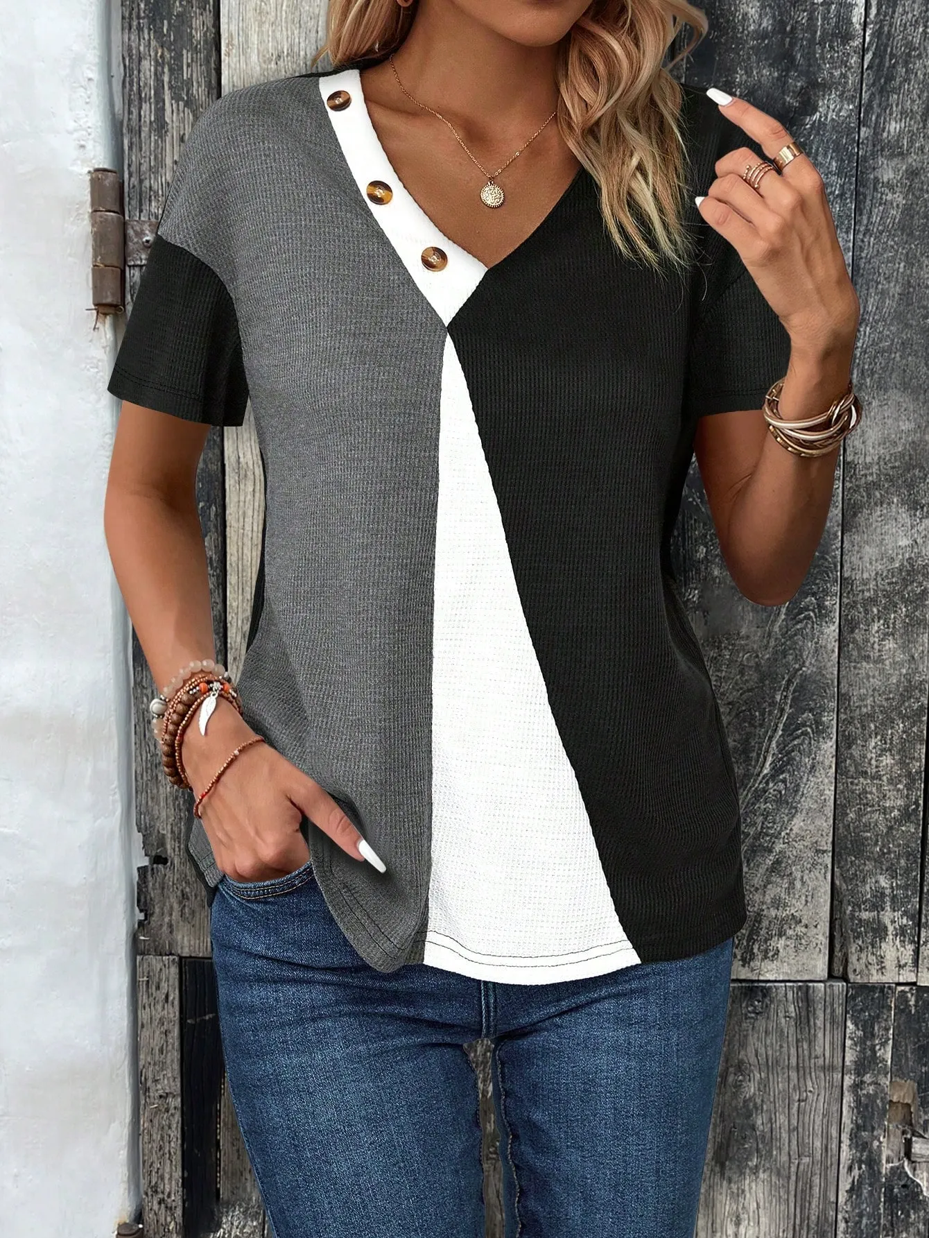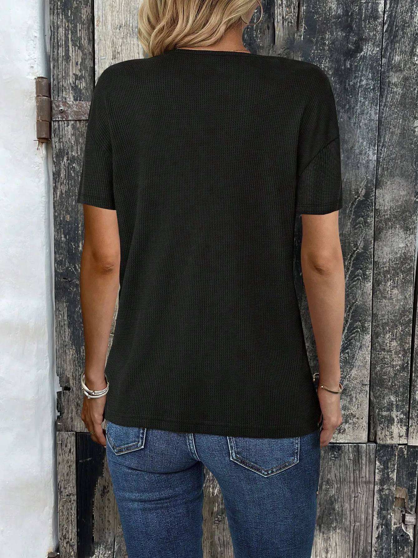 SMY Women’s V-neck Pleated Button Detail Casual T-shirt